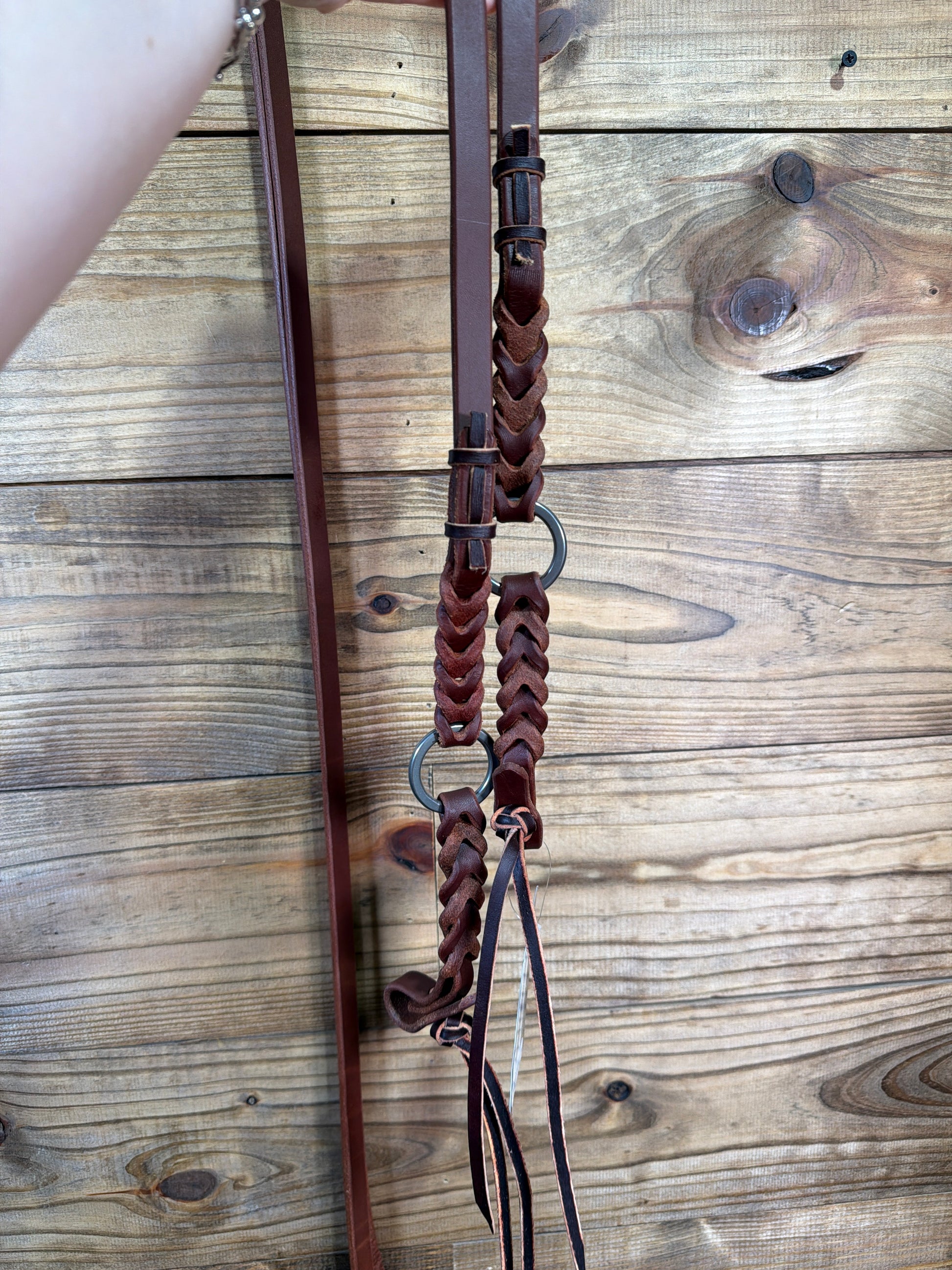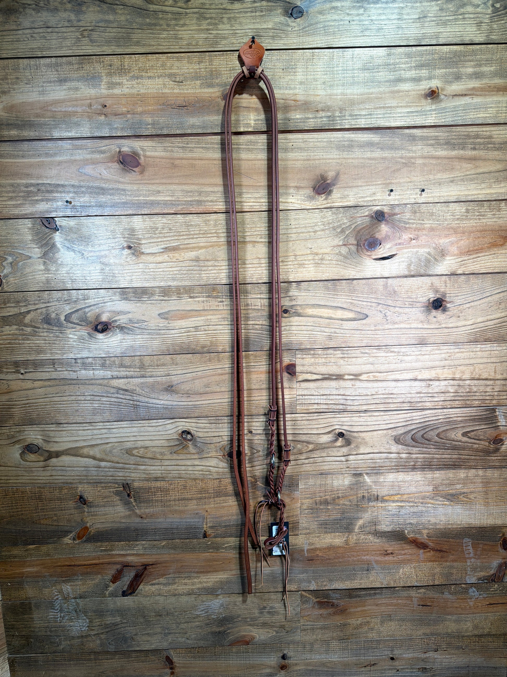 A balanced feel and smooth movement define this Bleeding Heart split rein. The oiled harness leather is soft in the hand, with a natural drape that makes the reins easy to handle. The signature Bleeding Heart detail at the waterloop and rein ends ties into the ring connection for a clean, cohesive finish. Completed with lace tie water loops.